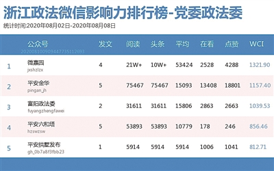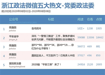 本期政法委榜,“微嘉园”依旧蝉联榜首,前五热文中,“微嘉园”有3篇上榜,《告市民书》一文阅读量更是直冲10万+。