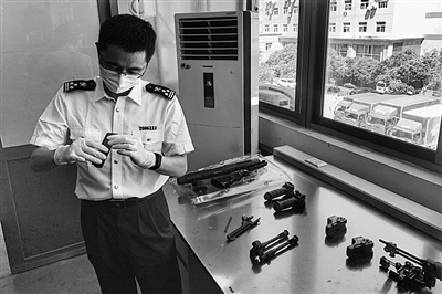 本报讯 如果不经在场海关关员的提醒,一般人很难发现,眼前这些不起眼的散件大有来头。“它们和普通的玩具不太一样,都是钢铁金属制品。筒套、弹匣、瞄准器,比例也与实际枪支的相仿。”8月12日上午,钱江海关驻邮局办事处副科长陈攀现场介绍时,身后的进境邮件查验台上展示的这些枪支散件,都是被海关关员的火眼金睛当场识破的。