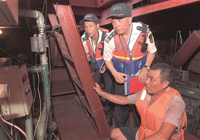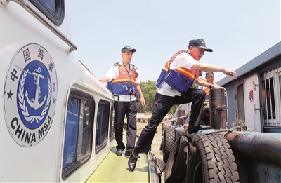 固定完缆绳,康朝忠和同事李先文一个箭步登上货船。记者拉开舱门站到巡逻艇的船舷上,迎面袭来的热浪让人有种窒息的感觉,手下意识地扶住了巡逻艇的栏杆,一阵灼痛感立刻传到手掌。