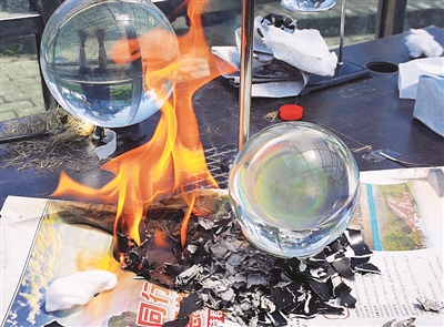 一切准备就绪,实验开始。只见消防人员先将一个透明玻璃球固定到一个架子上,然后在太阳光照射后形成的聚焦点上放上一张报纸,并开始计时。