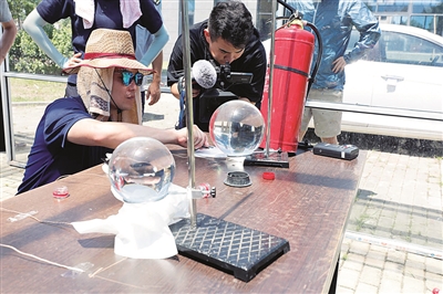 | 消防人员在玻璃房内进行玻璃球聚光实验 |