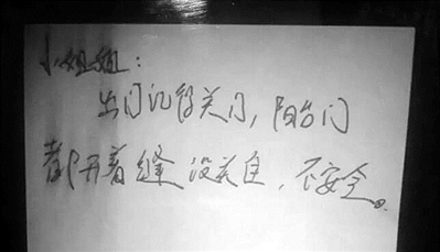 本报讯 “小姐姐:出门记得关门,阳台门都开着缝没关住,不安全。”近日,24岁的包女士回到杭州萧山区城厢街道的租房后,发现了这张字迹歪歪扭扭的字条。
