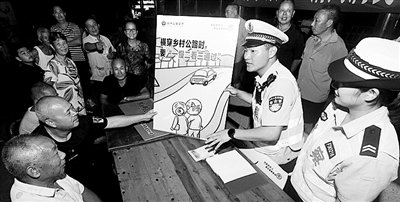 傍晚,台州市路桥区路南街道西夏村的民众认真听交警讲解交通安全知识。近日,台州市交通警察局直属三大队一中队的交警,来到公路沿线的文化广场和公园,为正在乘凉、休闲的村民讲解交通安全,倡导文明出行。王保初 摄