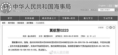 中华人民共和国海事局发布航行警告,自2020年8月24日00时至9月30日24时,在以39-24-35N 119-13-44E为基点,半径25公里,正东方向至正南偏西6°、夹角96°的扇形区域内,执行实弹射击活动,禁止驶入。