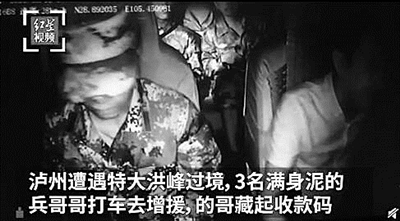 近日,四川泸州遭遇特大洪峰过境,3名满身泥巴的兵哥哥打车去增援,临下车时,出租车司机雷宇把收款二维码给藏了起来。双方“僵持”了一两分钟后,兵哥哥连声道谢后下车。雷宇一边叮嘱他们拿好随身物品,一边说“泸州人民感谢你们”。