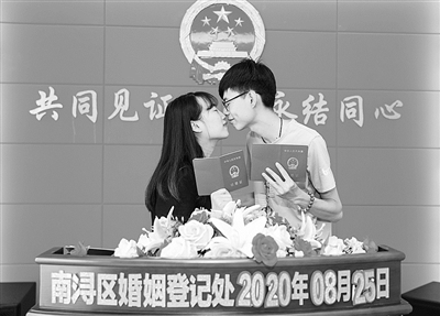 8月25日,在湖州市南浔区民政局婚姻登记处,一对新人在领取结婚证后合影纪念。