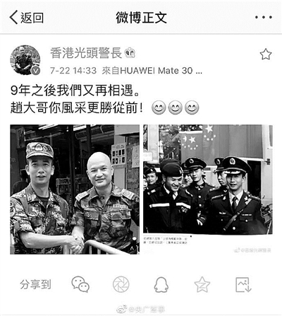 8月31日,随着最后一批口罩的过境交付,深圳中英街军民支援香港同胞战疫的34200只N95口罩全部捐赠送达香港沙头角边界警区。在这次捐赠中,被网友们亲切称为“光头刘Sir”的香港警长刘泽基还遇到了9年前一起在中英街上巡逻执勤的武警赵文超,他连声说:“我们是一家人,一起努力抗击疫情!”