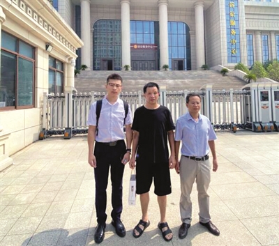 | 张玉环与其国家赔偿案代理律师程广鑫(左一)、罗金寿(右一) |
