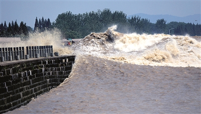 9月3日,钱塘江大潮在北岸海宁市丁桥段巨浪滔天,翻江倒海,蔚为壮观。