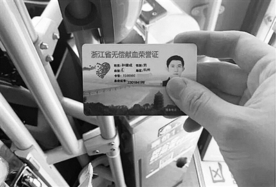今年7月19日,孙健成准备坐公交回住所,上车时,向驾驶员出示了献血4000毫升后获得的《浙江省无偿献血荣誉证》。孙健成说,根据《浙江省实施〈中华人民共和国献血法〉办法》有关规定,他能凭该证免费乘车公交车。