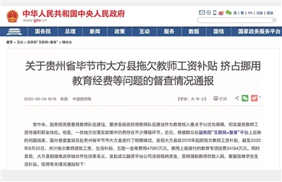 近日,有民众在国务院“互联网+督查”平台上反映拖欠教师工资补贴问题。大方县自2015年起即拖欠教师工资补贴,截至2020年8月20日,共计拖欠教师绩效工资、生活补贴、五险一金等费用47961万元,挪用上级拨付的教育专项经费34194万元。