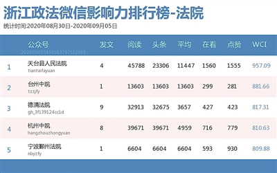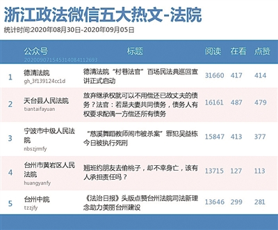 本期法院榜,黑马“天台县人民法院”一举夺魁,《放弃继承权就可以不用偿还已故丈夫的债务?法官:若是夫妻共同债务,债务人有权要求配偶一方偿还所有债务》一文获得了16161的阅读量。“德清法院”同样成绩不错,《德清法院“村巷法官”百场民法典巡回宣讲正式启动》一文拿下热文榜第一。