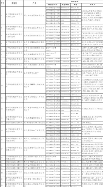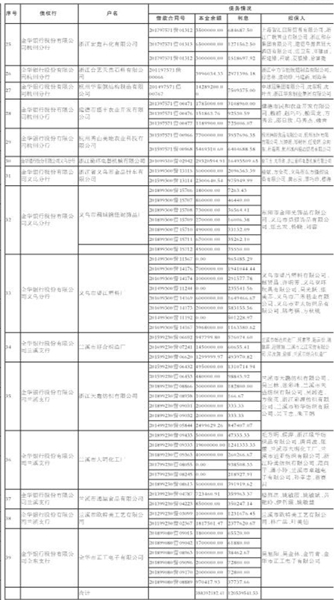 单位: 人民币元 注:1、清单中“担保人”包括保证人、抵押人、出质人,担保人的担保范围以签署的合同等法律文件约定为准。如公告中债务人、合同编号、债权金额、担保人等信息与事实不符的,以签署的合同等法律文件约定为准。 2、本公告清单仅列示截至2020年3月31日的贷款本金余额,借款人和担保人应支付给浙江省浙商资产管理有限公司的利息、罚息、违约金及其它应付款按借款合同、担保合同及中国人民银行的有关规定或生效法律文书确定的方法计算。已经进入诉讼程序及执行程序的,并已由金华银行股份有限公司垫付的应由借款人及担保人负担的诉讼费、执行费等以有关法律文书确定的金额为准。 3、若借款人、担保人因各种原因更名、改制、歇业、吊销营业执照或丧失民事主体资格的,请相关承债主体及/或主管部门代位履行义务或履行清算责任。 |