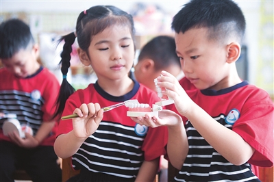 在9月20日全国爱牙日来临前,为了让孩子们学习正确的刷牙方法,从小培养爱护牙齿的好习惯,湖州市长兴县夹浦镇中心幼儿园开展了“护牙大作战”的爱牙日系列主题活动,通过模型、图片、互动练习、游戏等多种方式让孩子们了解牙齿的构造,学习正确的刷牙方式。
