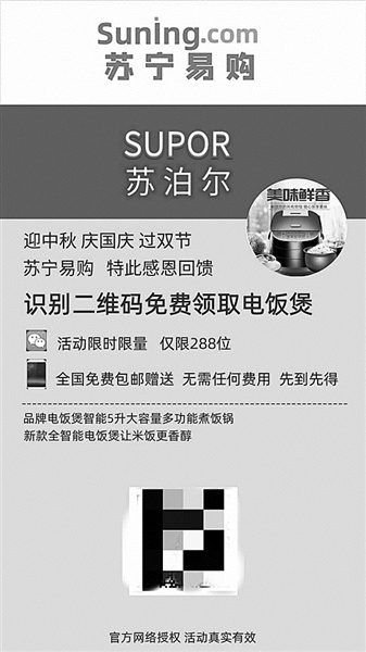 “迎中秋、庆国庆,苏宁易购感恩回馈,识别二维码免费领取电饭煲。”近日,微信朋友圈中流传着一张“苏宁易购免费送电饭煲”的截图。不少市民信以为真,纷纷按截图上的指示操作。真有这等好事吗?