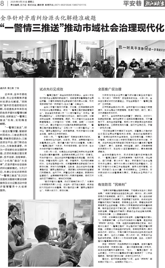 “一警情三推送”由金华市委政法委牵头,金华公安主动对接综合治理相关职能部门,将疑难复杂警情推送给责任民警、分管所领导和综治职能部门进行源头化解,形成党委领导下的“政府部门+社会力量”化解合力。