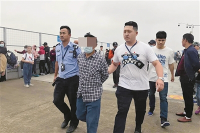 2名便衣民警穿过人群,快步靠近一名中年男子,一把将他抓住。听到民警叫出自己的名字,男子没有一点反抗,被民警拷上手铐后带走。