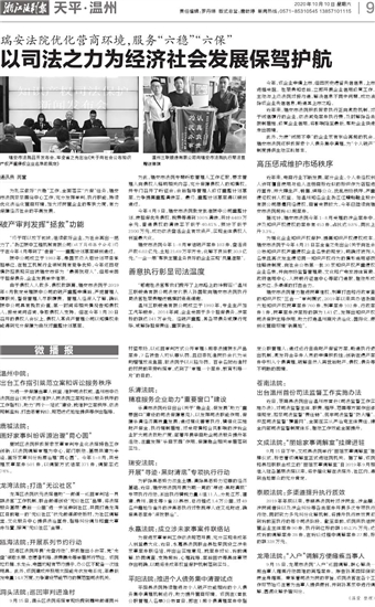 为扎实做好“六稳”工作、全面落实“六保”任务,瑞安市法院紧紧围绕中心工作,充分发挥审判、执行职能,持续优化法治化营商环境,加大对民营企业的帮扶力度,有力保障经济社会的平衡发展。