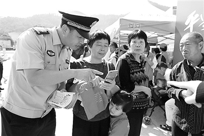 近日,三门县公安局海游派出所民警在辖区摆起“警务地摊”,积极开展防范电信诈骗宣传活动。期间,民警组织大家参与“平安三门,全民反诈”有奖答题,获得群众好评。图为民警讲解防范知识。通讯员 沈晨曦