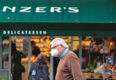 10月12日,一名男子戴着口罩从英国伦敦一家商店前走过。