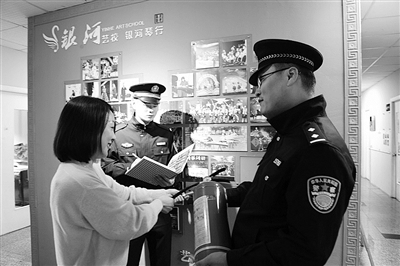 近日,东阳市公安局南市派出所民警来到辖区多家辅导学校,开展安全检查,及时消除校园安全隐患。图为民警指导老师使用灭火器。