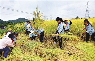 “世界粮食日”到来之际,武义县三角店小学开展“节约粮食 从我做起”主题教育活动。小朋友们通过下田割稻、捡拾稻穗、辨认农作物等活动,体会种粮的辛劳,养成爱粮、惜粮、节粮的好习惯。图为10月15日,小朋友们在壶山街道正新屋村体验割稻、打稻。