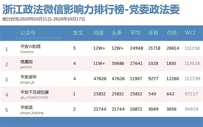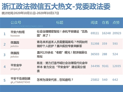 本期政法委榜,“平安六和塔”蝉联榜首,“微嘉园”步步紧追。热文榜上,“平安六和塔”的《社会治理精密智控!余杭平安建设“五色图”来了!》一文,获得最高阅读量和点赞数。平安余杭怎么建?可以在这篇文章中一探究竟。