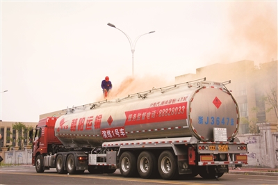 近日,台州市交通局、市交警局、台州湾新区应急管理局等部门联合举办了危险货物道路运输突发事故应急处置演练活动。来自各县(市、区)的100多家重点单位现场观摩了成品油火灾应急处置、危化品道路运输事故应急处置、液化石油气槽罐车道路运输泄露事故应急处置等3个项目的演练过程。图为救援人员正在演练油罐车突发火情事故处置。