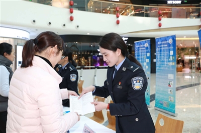 | 日前,椒江区公安分局组织开展了“你我同心,反诈同行”集中反诈宣传活动,向辖区群众宣传反诈知识。右图为民警正在向商户宣讲防诈知识。通讯员 王林生/摄 |
