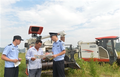 | 连日来,三门县公安局健跳派出所民警深入田间地头,向农用车司机宣传安全知识,。左图为民警在为收割机司机讲解宣传防范知识。通讯员 林利军/摄 |
