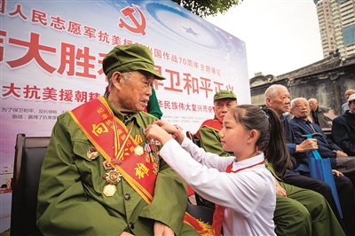 10月25日,瑞安市抗美援朝历史教育馆组织开展“纪念中国人民志愿军抗美援朝出国作战70周年”活动,15位志愿军老兵向小学生们讲述亲身经历的故事。同学们为志愿军老兵戴上红领巾、献上鲜花,祝愿他们健康长寿。