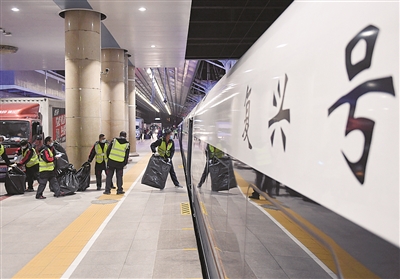 11月1日,工作人员在北京西站将货物装车。当日,铁路“双11”电商黄金周运输服务启动,持续至11月20日。铁路部门充分发挥高铁成网运行和安全快捷等优势,优化运力供给,首次试点复兴号动车组整列装运快件,努力满足人民群众日益增长的物流服务需求。