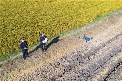 11月3日,长兴县太湖街道官?居委会一处农田里,长兴县综合行政执法局机动中队队员正利用无人机进行秸秆焚烧点位巡查。长兴县综合行政执法局推行“陆空一体”巡查监管机制,通过数字化装备——四旋翼航拍一体无人机,第一时间发现并处置秸秆焚烧火点,防止污染大气,保护生态环境。