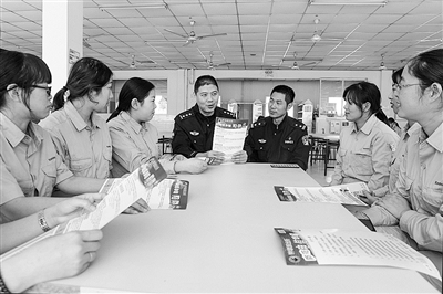 连日来,平湖市钟埭派出所民警利用员工吃饭休息时间,在企业食堂开展电信网络防诈骗宣传。图为11月3日中午,民警现场普及电信网络防诈知识。通讯员 傅佳艳