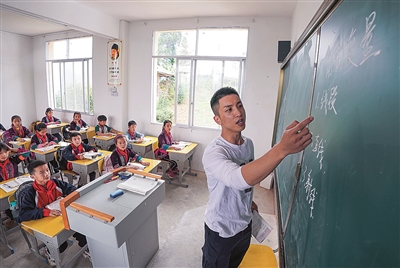 | 在良培小学支教的李海弟来自舟山边检站,在这里,他既是数学老师,又兼音乐和体育教学 |