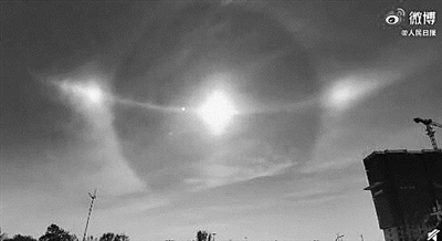 11月4日10时30分许,内蒙古通辽市科左后旗甘旗卡镇上空出现了“三个太阳”。当地气象部门表示,这是一种奇异的光学现象,由整齐排列在空中的冰柱折射所形成,称为幻日。