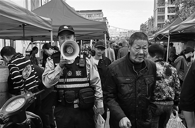 近日,台州市公安局椒江区分局府前派出所民警来到当地集市,挤进人流中,握着小喇叭、操着本地方言,提醒赶集群众“管好财物、小心扒手”。