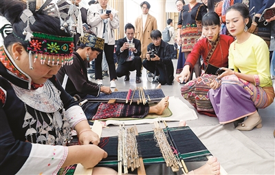 11月16日,40名来自黎族、苗族、傣族的学员从浙江理工大学“织锦技艺传承及创意设计研修班”毕业。他们现场展示了个性理念与非遗碰撞出来的艺术品,有苏州宋锦、海南黎锦、云南傣锦、畲族织带等,这些产品不但在线下零售,还有主播现场直播带货。吕之遥 摄