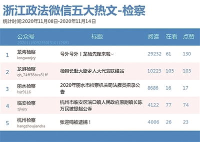 本期检察院榜,黑马“龙湾检察”拿下“双料冠军”。该公众号热文《号外号外丨龙检先锋来啦》对10月推选出的“龙检先锋”候选人作了亮相介绍,并在线上进行投票活动,收获近3万网友的关注。