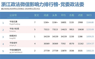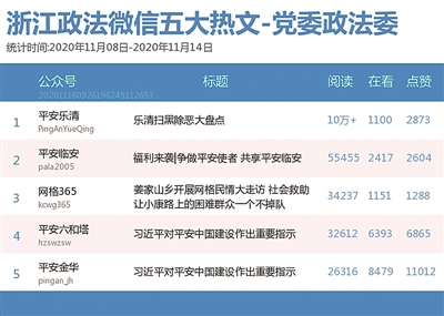 政法委榜上,黑马“平安乐清”表现十分抢眼。该公众号不仅拿下了影响力榜的冠军,其热文《乐清扫黑除恶大盘点》更是以10万+的阅读数位居热文榜榜首,文中将乐清过去3年具有代表性的扫黑除恶案件整理成集,并详细解读。看来大家对打击黑恶势力的关注度和参与度还是很高的。