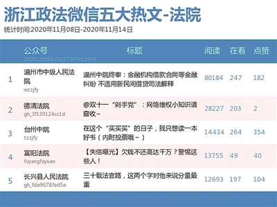 本期法院榜,前三名依次是“温州市中级人民法院”“台州中院”“德清法院”。其中,“温州市中级人民法院”《温州中院终审:金融机构借款合同等金融纠纷 不适用新民间借贷司法解释》一文获得热文榜第一名。该文报道,温州市瓯海区法院于日前对平安银行温州分行与洪某金融借款合同纠纷一案作出民事判决。平安银行温州分行就该案提起上诉,温州市中院进行了公开宣判。