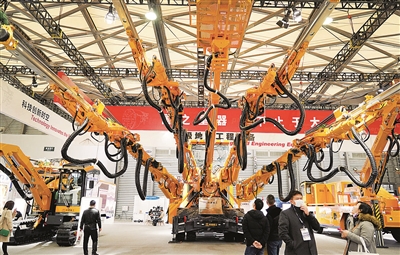 11月24日,上海国际工程机械、建材机械、矿山机械、工程车辆及设备博览会(简称“上海机械展”)在上海新国际博览中心拉开帷幕。本届博览会以“行稳致远、决胜未来”为主题,来自中国、美国、德国和意大利等国家和地区的近3000家企业携各自最新产品亮相。数字化、智能化和新能源动力成为众多参展企业的共同发展方向。图为当日参观者走在一台用于隧道钻爆挖掘的四臂凿岩台车下。