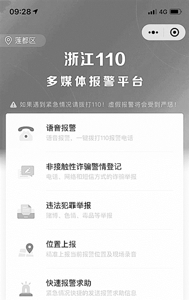 “浙江110”微信报警小程序是浙江省公安厅情报指挥中心为方便群众报警推出的一款互联网便民报警应用。主要有以下功能:一是点击“语音报警”,可以直接跳转拨打110进行电话报警;二是遇到电信网络诈骗时,可以在“非接触性诈骗警情登记”一栏上传相关被骗信息,进行报警;三是发现的一些公安机关管辖的违法犯罪线索,可以在“违法犯罪举报”一栏进行举报;四是打110电话报警说不清位置时,可以点击“位置上传”,将自己所在位置发送给当地110报警服务台;五是点击“快速报警求助”,可以快速获取自己所在位置,录入内容、照片等信息后发送给当地110报警服务台报警。