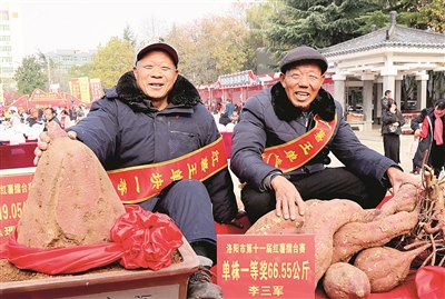11月29日,荣获红薯王单株和单块一等奖的两位种植户高兴地合不拢嘴。