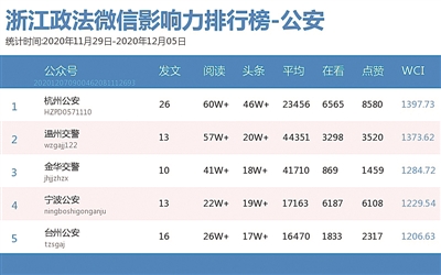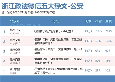 公安榜上,“杭州公安”“温州交警“”金华交警”分列前三。“杭州公安”凭借《杭州女子谈了场恋爱,276万没了!》一文拿下热文榜第一。“温州交警”表现也相当亮眼,本期共有3篇“10万+”热文闯进前五,赞!