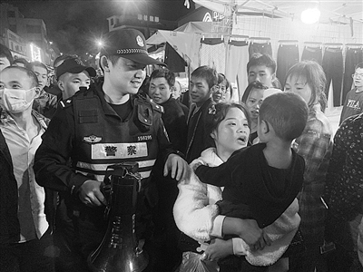 入秋后,传统的乡镇农村交流会陆续举办。10月31日,是南马镇南马村农历九月半交流会,傍晚后人声鼎沸更热闹。晚上8点多,何健楠拿着喇叭提醒人群注意防范扒窃和诈骗时,发现一个小男孩独自哭泣,赶紧将他抱起,沿途边找边用大喇叭喊话“谁家孩子走散了”,终于找到了在人群中被挤散的男孩妈妈。