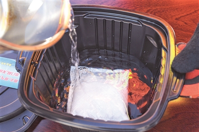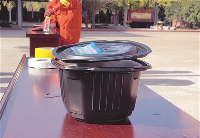 一切准备就绪,消防员先将自热火锅盖的出气孔进行封堵,然后将自热火锅的发热包放至底部后,倒入适量的清水,并快速将盖子完全盖紧,以模拟成日常在泡方便面时习惯性将盖子完全密闭的状态。