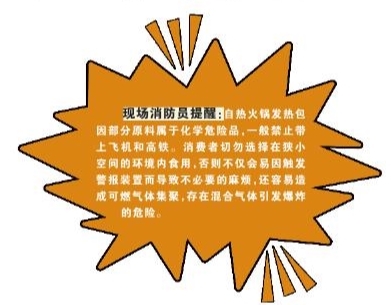 | 现场消防员提醒:自热火锅发热包因部分原料属于化学危险品,一般禁止带上飞机和高铁。消费者切勿选择在狭小空间的环境内食用,否则不仅会易因触发警报装置而导致不必要的麻烦,还容易造成可燃气体集聚,存在混合气体引发爆炸的危险。 |