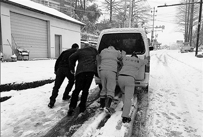 12月14日,临安公路抢险队员在积雪道路抛洒除雪剂,清除倒伏竹子,帮助打滑车辆脱困,确保雪后道路安全畅通。董旭明 裘泽城 摄