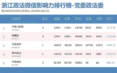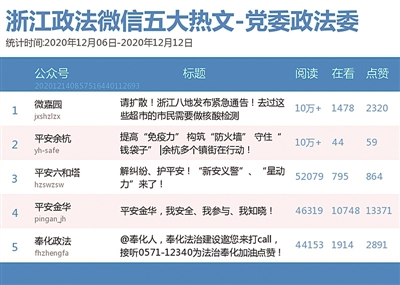 本期党委政法委榜,“平安六和塔”“微嘉园”“平安金华”分获冠、亚、季军。热文榜上,“微嘉园”发布的热文《请扩散!浙江八地发布紧急通告!去过这些超市的市民需要做核酸检测》夺得热文榜首。疫情面前不可松懈,请广大市民继续积极支持和配合疫情防控工作。